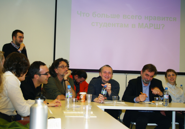 Под занавес презентации школы студенты, отучившиеся в ее стенах почти год, поделились с гостями своими впечатлениями. Так, Юлия Андрейченко на вопрос «Трудно ли учиться в МАРШе?», не задумываясь, ответила, что трудно, но при этом «созданы все условия для того, чтобы учиться было легко». Все без исключения высказавшиеся студенты отмечали особый, абсолютно новый подход к обучению, когда на плечи студента ложится такая степень ответственности, что он может почувствовать себя настоящим профессионалом, когда «из мелочей, из личных чувств и переживаний складывается архитектурный проект», когда дистанция между педагогами и студентами сведена к минимуму. Ребята, особенно приехавшие учиться в МАРШ из других городов, признавались, что, например, Сергея Скуратова раньше видели только на картинках, а теперь он стал для них не только педагогом, но и другом.