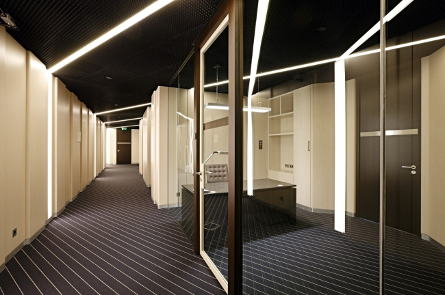 Остальная часть этажа, включая коридоры и офисы, решена столь же эффектно, хоть и более прагматично. Функциональное и типологическое отличия нового этажа отразились и на его дизайнерском оформлении. Базовый принцип – использование контрастного сочетания деревянных и стеклянных стен – сохранен, но трактован он совершенно иначе. Большая часть стен здесь облицована панелями из беленого дуба (лишь приемные отделены от коридоров прозрачными стеклянными перегородками, в которые врезаны дверные порталы из темного дерева), фактура и цвет которого подчеркнуты энергичным световым дизайном и более радикальным колористическим решением потолка (черные перфорированные грильято). Несмотря на столь респектабельные и в хорошем смысле слова традиционные материалы, офис чем-то напоминает кадры из фантастических фильмов – в первую очередь, за счет светильников, инсталлированных в стены и потолок. Расположение и ширина каждого плафона определены сеткой параллельных линий, наложенной на план этажа: потолочные конструкции и стены коридоров, огибающие центральный лестнично-лифтовой узел, она пересекает под различными углами, благодаря чему плоскости стен и акцентные элементы (линии на ковролине, потолочные панели и светильники) существуют в разных пространственных системах. Это создает необычный оптический эффект трансформирующегося пространства, который многократно усиливается за счет отражений в стеклянных перегородках.
