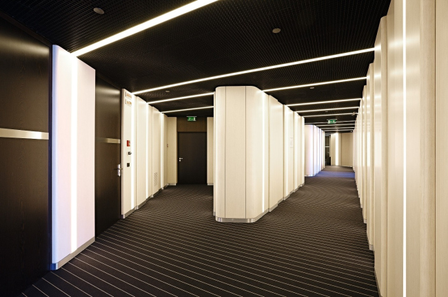 Светильники, встроенные в деревянные панели, стали составной частью оригинальной конструкции облицовки стен. Значительная протяженность коридоров потребовала разработки решения одновременно эстетичного, технологичного и экономичного. Вместо горизонтального монтажа панелей из беленого дуба, требовавшего особой тщательности в стыках и примененного на нижних этажах, здесь было решено устанавливать вертикально панели высотой от пола до подвесного потолка. Было разработано специальное крепление, легко удерживающее панели под их собственным весом: каждая из них имеет рельефное скругление на краях и монтируется внахлест с соседней, что вместе со светящимися вставками создает интересную пластическую игру на всем протяжении коридора.
