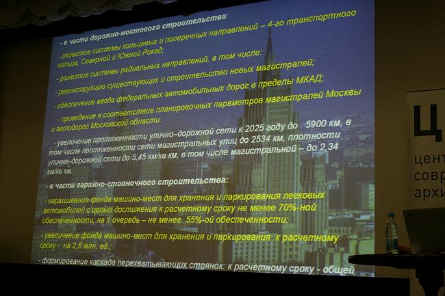 Нынешний генплан Москвы был принят в 1999 году, а в 2005 – утвержден законом «О Генеральном плане города Москвы». Одновременно с утверждением приняли решение о его актуализации, то есть улучшении, каковое и было поручено НИиПИ Генплана. Ответственным за разработку стал замдиректора этого института Олег Баевский, который по приглашению ЦСА прочитал 12 ноября лекцию о новом генплане. По словам Олега Баевского, генплан 1999 года – первый постсоветский градостроительный план, был основан на устаревших исследованиях восьмидесятых – девяностых. За прошедшие годы изменились отношения Москвы с областью, был принят новый градостроительный кодекс, а главное – город насытился инвестициями. Поэтому старый «генплан возможностей», ориентированный на привлечение капиталов, сейчас переориентируется на социальные проблемы. Приоритетами актуализированного градплана названы «экологическая, санитарная и техническая безопасность города, сохранение культурного и природного наследия, предоставление социального значимых объектов и надежность функционирования инженерной и транспортной системы». В связи с этим актуализированный генплан предполагает изменение некоторых «особо охраняемых границ». Так, общая площадь «природных зон» в нем увеличена с 17 до 23 тыс. га, «территории объектов культурного наследия» – с 6,9 до 10 тыс.га, а «зоны охраны объектов культурного наследия» – до 55 тыс. га. Среди социальных проблем лидер – жилье. Сейчас 40% всего, что строится в городе – это т.н. «инвестиционное» жилье, то есть предназначенное для последующей продажи. Актуализированный генплан предполагает увеличить фонд социального жилья не менее чем на 2 млн. кв. м., сделав соотношение коммерческих/социальных жилплощадей в городе равным 40/60. Что касается ветхого жилья, то по словам Олега Баевского, оно какими темпами выходит из строя, что стройиндустрия с ним справиться не может и его объем планируется по возможности сократить – до 10 процентов. Одной из острых проблем Москвы Олег Баевский назвал ее замкнутость в собственных границах, которые «больше не будут расширяться», поэтому развитие города возможно только за счет внутренних резервов. Один из таких резервов – производственные территории в за Третьим транспортным кольцом. Многие, хотя далеко не все предприятия будут выводиться, а их территории станут основными площадками для нового строительства, как коммерческого, так и жилого. Те производства, которые сохранятся, по заверению Баевского, должны стать примерами интеграции производства, бизнеса и высшей школы. Периферийная зона Москвы, в отличие от активной срединной части, должна стать «легкими города», роль которых ранее исполнял зеленый пояс вокруг МКАД, сейчас активно застраиваемый как областью, так и городом в целях все той же экономической отдачи. Транспортные перегрузки, бич крупных городов, решаемый самыми разными способами начиная от перехода на общественный транспорт (самый яркий пример Амстердам), до введения платного въезда в центр города (Лондон), в Москве будет решаться несколькими способами. Пока еще в городе 60 % поездок совершается на общественном транспорте и поэтому на нем в генплане сосредоточен главный акцент. Одной из главных причин транспортной непроходимости Москвы названа медленная прокладка линий метро – на данный момент и