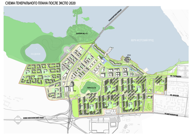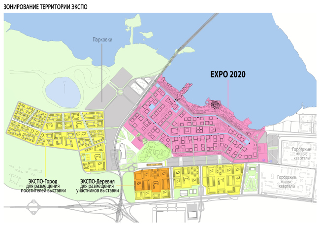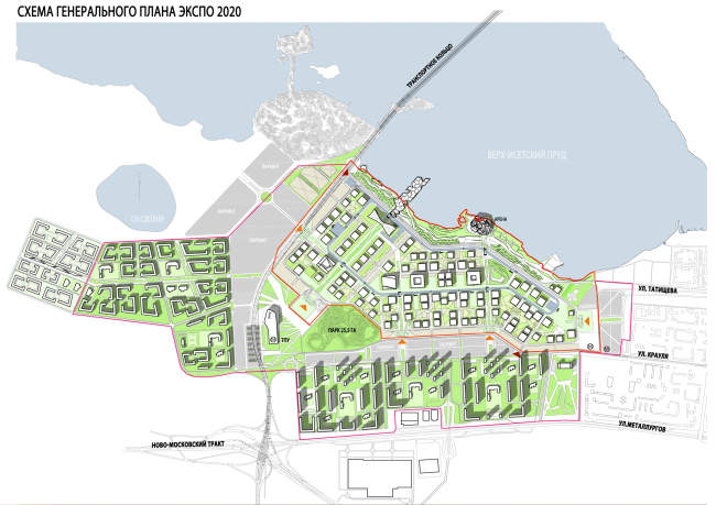 Существующие улицы Екатеринбурга задают основные оси вновь проектируемой территории Экспо-парка и его жилых кварталов, что, по замыслу архитекторов, обеспечит максимально органичное включение осваиваемого участка в сложившуюся структуру города. Впрочем, это лишь одна из задач, стоявших перед авторами концепции. В планировке выставочной зоны были учтены самые разные факторы. Это и равномерность распределения точек притяжения и сервисов для посетителей, и легкость ориентации в пространстве выставки, и доступность каждого отдельно взятого павильона. Всего на выставке будет 103 павильона, они будут образовывать площади, а эти площади, в свою очередь, как бусины на нитку будут «нанизаны» на главную пешеходную ось, которая пройдет с запада на восток.