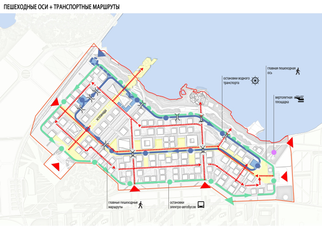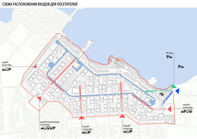 Главный вход в Экспо-парк находится в непосредственной близости от транспортного терминала. Кроме того, на территорию выставки можно будет попасть со стороны остановок городского автобуса, непосредственно из центра города и из Экспо-деревни. Помимо собственной станции метро, «ЭКСПО» планируется связать с сердцем Екатеринбурга веткой трамвайного сообщения, а рядом будет построена вертолетная площадка для VIP-персон. Внутри же Экспо-парка будет использоваться только экологически чистый транспорт – электроавтобус, маршрут которого охватывает по периметру всю выставочную зону, и водный трамвай. Для трамвая авторы предлагаю вырыть кольцевой канал, который естественным образом заполнится водой из пруда.