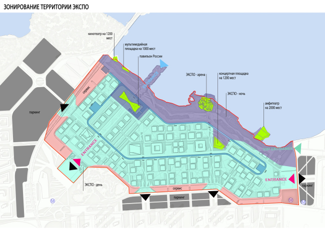 За павильоном России ось эспланады будет продолжена развитым пирсом, который задуман как площадка для проведения световых шоу и фейерверков. Вся территория выставки поделена на дневную и вечернюю зоны. Когда работа павильонов заканчивается, посетители перемещаются на набережную. Решенная как большой естественный парк, она наполнена множеством сооружений для вечерних мероприятий: экспо-арена, амфитеатр, кинотеатр, мультимедийная и несколько многофункциональных площадок.