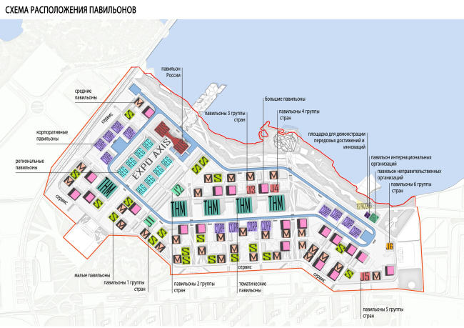 Как заведено на «Экспо», крупные страны-участницы построят павильоны самостоятельно, а державы поскромнее займут часть так называемых джоинтов, которые возведет принимающая сторона. Кроме того, на выставке появится немало корпоративных и тематических павильонов, а также павильоны федеральных округов России. Последние планируется выстроить вдоль главной аллеи – парадной эспланады, которая берет свое начало от главного входа. Ее перспективу замкнет павильон России, который предполагается сделать в виде моста, символически соединяющего Европу и Азию.