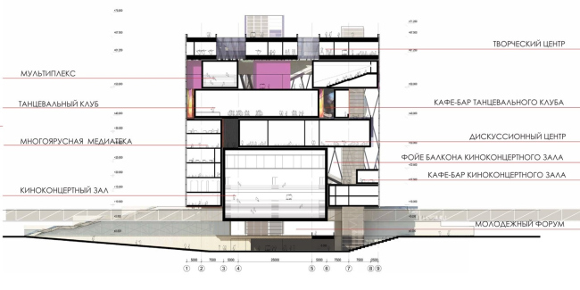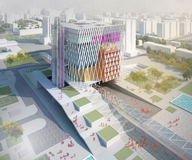 Фасады здания выполнены из ромбовидных сетчатых ячеек, заполненных стеклом, и в зависимости от освещения способны практически полностью исчезать, максимально выявляя внутреннюю структуру здания и делая ее полноправной участницей архитектурного образа. «Содержимое» куба действительно зрелищно – из объемов разной формы и величины архитекторы складывают замысловатую композицию. Есть здесь и параллелепипеды, и кубики, и конусы, и даже шар – сферический объем Детского центра предполагается подвесить на стальных тросах к перекрытию верхнего этажа. Каждый блок выделяется собственным ярким цветом и фактурой отделочных материалов, а в промежутках между ними и внешней оболочкой здания образуется целая система атриумных пространств – холлов, фойе, террас. Интересно, что «Студия 44» частично скорректировала функциональную программу дворца, положив в основу его планировки принцип взаимозаменяемости помещений. Блоки сгруппированы по тематическому принципу, так что аудитории медиатеки соседствуют с трансформируемым залом Дискуссионного клуба и могут быть задействованы для проведения его самых крупных мероприятий. Возможность трансформации предусмотрена и для киноконцертного зала: сценический задник опускается как подъемный мост, образуя дополнительные зрительские места под открытым небом и тем самым объединяя зал и открытый амфитеатр.
