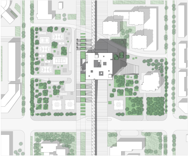 Подобную многофункциональность реконструируемого дворца «Студия 44» подчеркивает не только с помощью выразительного объема, но и градостроительными средствами. Трактуя сам дворец как комплекс, буквально нашпигованный помещениями самого разного назначения, архитекторы на уровне городского центра поддерживают его целой системой благоустроенных общественных пространств, нанизанных на единую ось и образующих пешеходный бульвар протяженностью 2,7 км. Променад, который планируется проложить от городского парка на берегу реки Есиль до проектируемого сквера на ул. Асан кайгы, объединит в пространственную мегаструктуру ряд административных зданий и отелей, Конгресс-центр, Дворец школьников и реконструируемый «Жастар». «Важно, что бульвар прокладывается в сложившейся городской ткани без ее радикального перекраивания и с безусловным сохранением существующих деревьев. Наш метод – не градостроительная хирургия, а, скорее, «городская акупунктура», – подчеркивает Никита Явейн. – Мы выявляем лишь те фрагменты среды, где преобразование средствами благоустройства и ландшафтной архитектуры может дать наибольший смысловой эффект, и верим, что подобный «лоскутный» принцип формирования городских пространств позволит создать целый калейдоскоп различных по характеру мест, которые будут словно перетекать друг в друга».