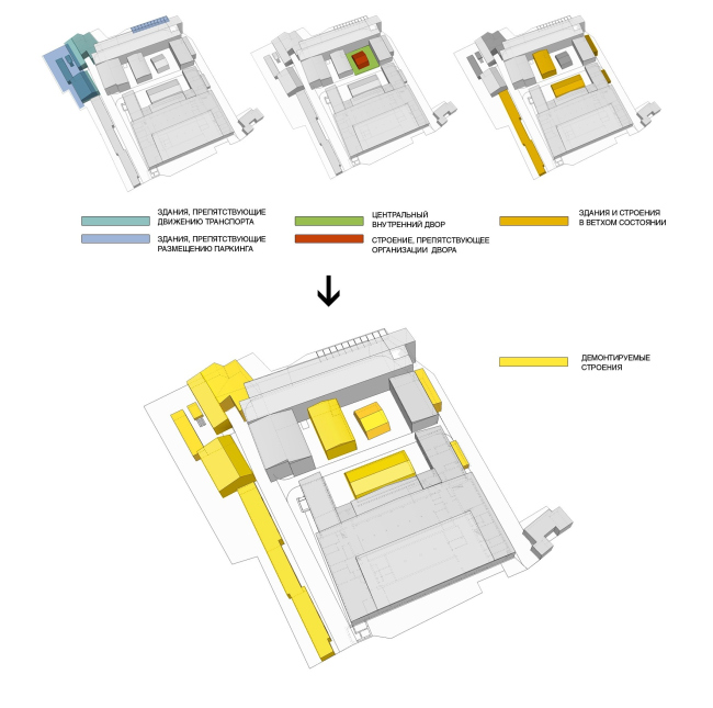 Сложность заключалась еще и в том, что заводские корпуса оказались совершенно разными по своей конфигурации и глубине. Здесь есть и вполне компактные прямоугольные в плане объемы, и узкие вытянутые «вагончики», и очень крупное строение в центре участка с большой глубиной этажа. Поэтому мало было в целом набросать стилистику будущего комплекса – для каждого объема архитекторы искали свое эффективное решение. Часть территории расчищается от старых гаражей и полуразрушенных построек ради создания общественного пространства, внутренней пешеходной площади Studio8 и организации парковки (впрочем, необходимое число машиномест удалось получить только за счет более дорогих автоматизированных паркингов).