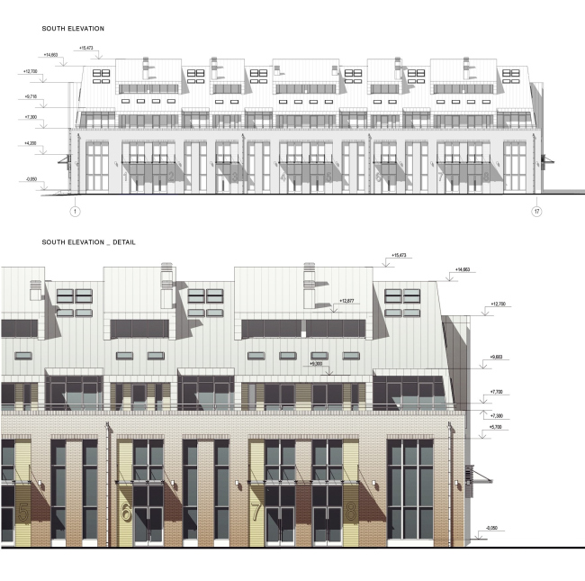 Придумать нечто оригинальное заказчика заставило отнюдь не (только) тщеславие. Дело в том, что ближайшим соседом бывшего завода является жилой комплекс «Триумф-палас» – 260-метровый небоскреб, претендующий на стилистическое родство с семью сталинскими высотками. Будущие апартаменты отделены от «Триумф-паласа» лишь узким внутриквартальным проездом, и понятно, что габаритами и классом жилья с ним тягаться бессмысленно. Но как-то обозначить, что новый комплекс имеет совершенно иное происхождение, девелоперу хотелось, и именно так он и сформулировал ТЗ для архитекторов – объект должен стать камерным и уютным городским кварталом, по возможности деликатно противостоя эстетике «элитного» и «закрытого» жилого комплекса «Триумф Палас». «Решение напрашивалось само собой: из-за разницы в этажности наш комплекс обращен к «Триумф-паласу» кровлей, поэтому мы превратили ее в пятый фасад», – рассказывает руководитель T+T Architects Сергей Труханов.