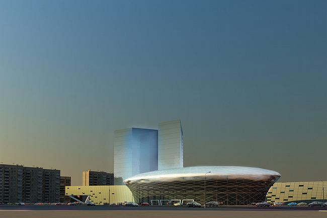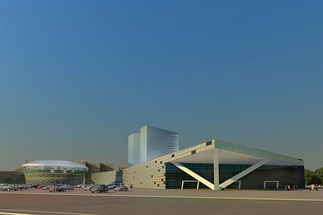 Решению подобной задачи посвящена архитектурная концепция спортивной школы Вячеслава Третьяка, представленная компанией iCube. В комплексе предполагается две основные части – собственно хоккейная школа и коммерческие площади в обычном составе: мегамол, супермаркет и офисный центр. Вторая, коммерческая, часть, судя по заявленным объемам площадей превышает первую, хоккейную аж в 9 раз – образно-архитектурная зарисовка от iCube изнутри оказывается, таким образом, характернейшим примером московского инвестиционного строительства. Как же оно выглядит снаружи?