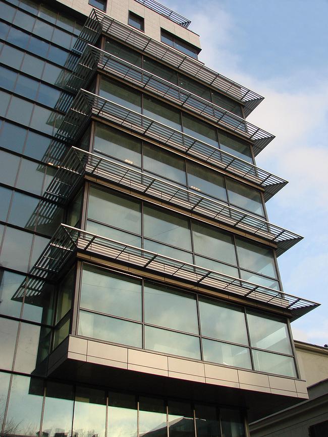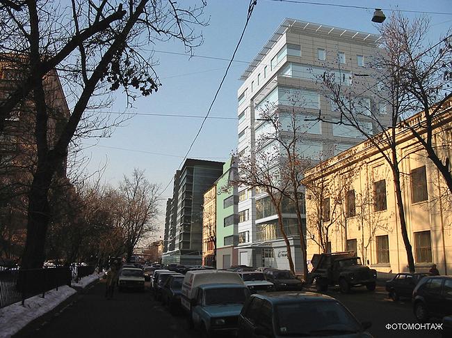 Все вместе образует вдоль улицы некоторый ряд, главную скрипку в котором сейчас играет новое банковское здание. Это удивительно, потому что фасад подчеркнуто скромен. Можно сказать, что он совмещает в себе три характерные черты: во-первых, это честный хайтековский модернизм, во-вторых, этот модернизм контекстуально «тих» и предупредителен – ничего кричащего. А в третьих – парадокс: скромник содержит в себе некоторый эмоциональный заряд, который он распространяет на свою небольшую – в пределах видимости – сферу влияния. В нем ощущается особенный подход к городской среде, свойственный доходным домам (да и банковским зданиям) XIX или начала XX века. Этот дом можно с легкостью представить в качестве одной из модернистских вставок во фронт застройки кварталов Парижа. Он как будто бы пересажен оттуда (или из Берлина) – сюда и теперь работает на оздоровление московской атмосферы.