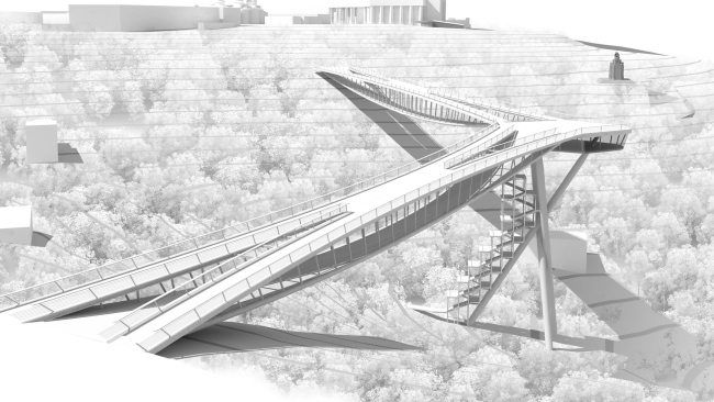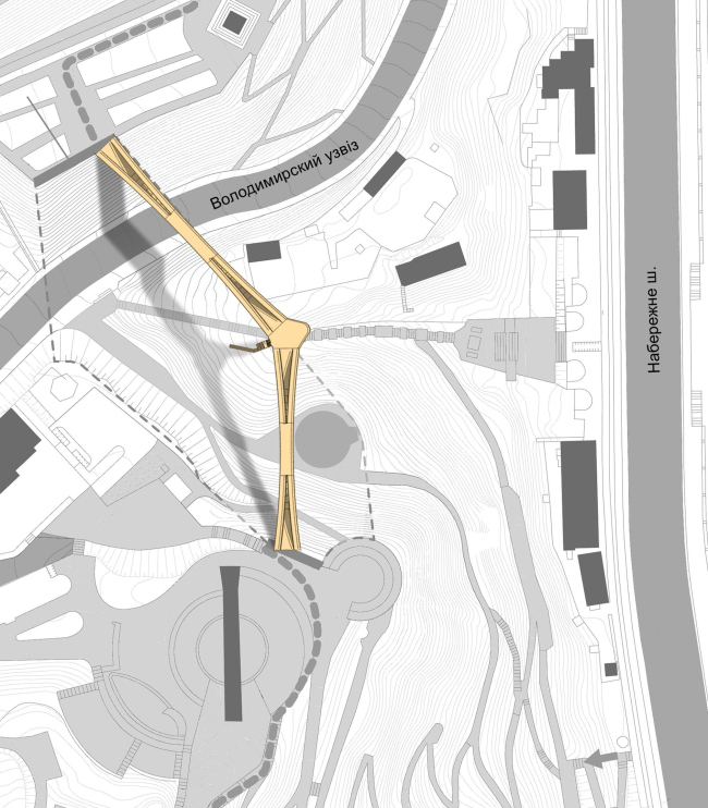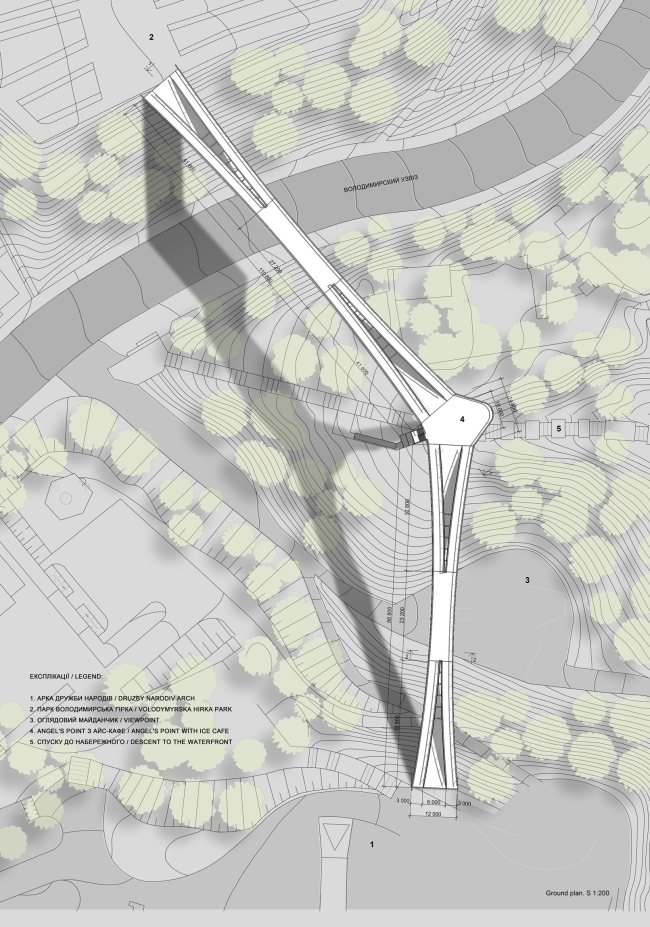 Новый мост свяжет два центральных парка Киева – «Крещатый» и «Владимирская горка». Дело в том, что формально являясь ближайшими соседями, эти парки сегодня фактически никак не взаимодействуют между собой: «Владимирская горка» находится на верхней и средней террасах Михайловской горы, а «Крещатый» разбит на склонах Днепра вдоль Владимирского спуска, и сильный перепад рельефа не позволяет сделать их частью единого пешеходного маршрута. Собственно, задачей конкурса и стало инженерно-архитектурное решение, которое устранит ландшафтные преграды и позволит гуляющим свободно перемещаться из одного парка в другой. А поскольку мост должен быть построен в самом центре украинской столицы, к его внешнему облику предъявлялись очень серьезные требования – эффектное внешне и достойное соседства с наиболее значимыми достопримечательностями Киева, сооружение должно еще и бережно отнестись к природному комплексу. «Архитектурное бюро Асадова» совместно с компанией ИСТОКСтрой – единственный российский участник этого конкурса, – в разработке своей концепции отталкивалось именно от необходимости минимизировать вторжение на территории парков. Предложив максимально щадящий, «ангельский» метод строительства нового моста, авторы и его архитектурный образ построили на сходстве с ангелом.