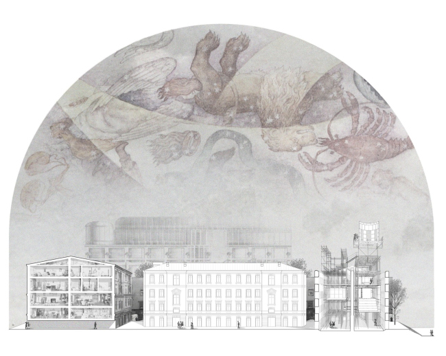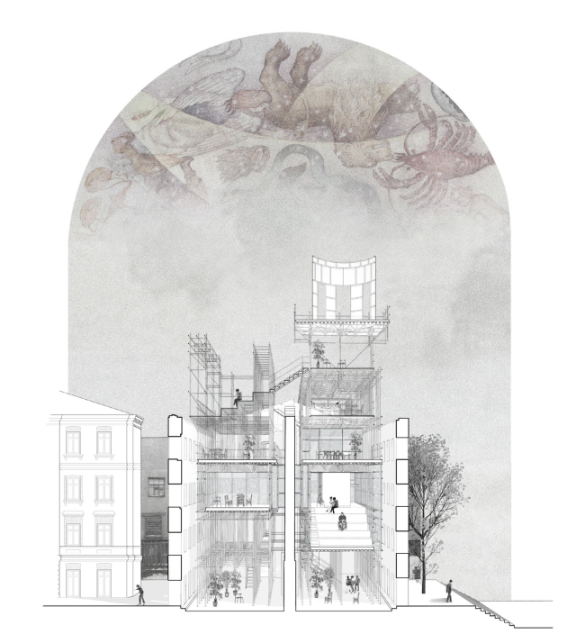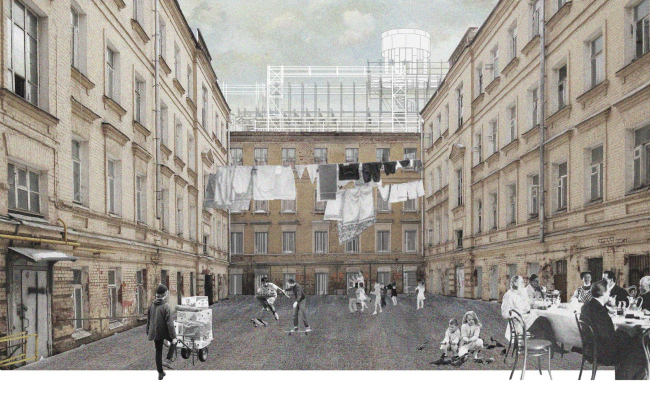 Городская коммуна. Автор: Анастасия Вайнберг В качестве «территории детства» Анастасия Вайнберг выбрала заброшенный квартал домов на малой Сухаревской площади. Основная идея проекта – конструирование идеального мира, существующего в соответствии с законами детства, формирование открытой городской коммуны. Один из корпусов, серьезно пострадавший при пожаре, по замыслу автора, должен стать сквозным городским пространством, которое свяжет внутренний двор квартала с Садовым кольцом. Внутри руинированного сгоревшего здания предлагается создать вертикальную городскую площадь и одновременно – главное общественное место коммуны. Здесь будут проходить учебные и творческие занятия и лекции для детей и взрослых, а также появятся библиотека, мастерские и т.д.