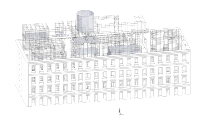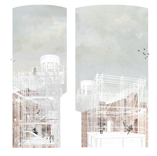 Приспособление руины к подобной эксплуатации предлагается осуществить за счет возведения клиночных лесов и остекления, которые формируют все внутренние помещения и открытые террасы. Это быстровозводимые конструкции, демонтировать которые можно столь же быстро, как и возвести. При этом они теплые и рассчитаны на круглогодичное использование.