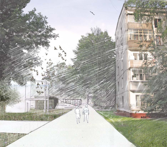 Симбиоз дачи и городского двора. Автор: Мария Карцева Проект выполнен на основе личных воспоминаний из детства автора. Главными территориями детства для Марии Карцевой были дача, выступавшая в роли одной гигантской игровой площадки, и городской двор, меньший по масштабам и строго ограниченный жилыми домами. В результате Мария предложила совместить обе территории. Пространство дачного поселка с его четкой структурой было разложено на несколько сеток: от самой маленькой – масштабом в шесть соток, до сетки дорог, главных ориентиров и границ визуального охвата. Все эти сетки, встраиваясь в структуру двора, где в качестве констант сохраняются только дома и зелень, формируют новое игровое пространство. Отсюда выводятся все автомобили, предусматривается мощение дорожек и площадей, озеленение и благоустройство территории. По периметру двора плотной стеной высаживаются деревья, создавая естественную границу безопасности. Помимо этого внутри двора появляются фруктовые сады, кустарники и растения, традиционные для дач. Также двор насыщается различными объектами – появляются спортивные и игровые площадки, скалодром, искусственная гора, велосипедные дорожки, мастерские, башни, лестницы, голубятня и т.д.