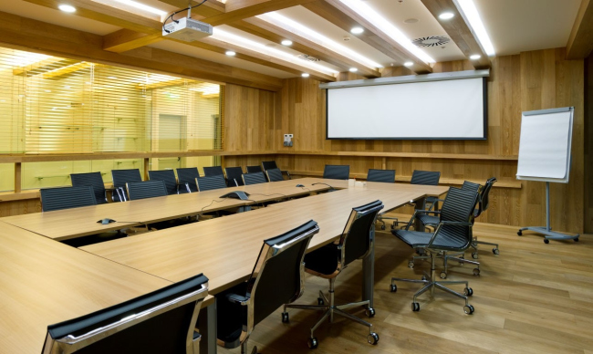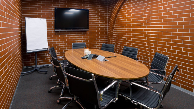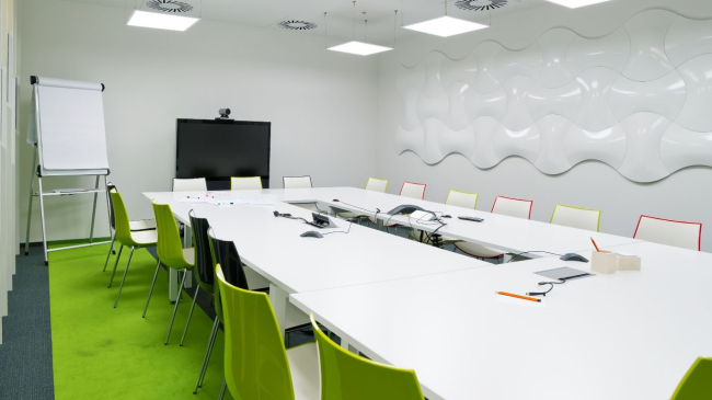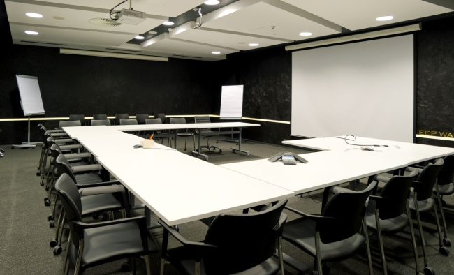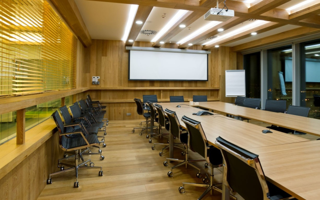 Ближе к исходной задумке удалось реализовать самую большую переговорную Diageo – своего рода «сводный штаб» всех продаваемых сортов виски. Стены этого помещения архитекторы отделали черной рельефной штукатуркой, которой придали фактуру отжатой кожи, а на уровне глаз сидящих за столами людей по всему периметру пустили узкую ленту светодиодной подсветки. Этот золотой шов, не бросаясь особо в глаза, напоминает о благородном цвете выдержанного виски.