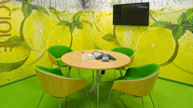 Очень характерной получилась и переговорная, посвященная венесуэльскому рому Касике. Здесь стены оформлены яркими фотопринтами коктейлей, в состав которых входит этот напиток. Фактически комната изнутри уподоблена стакану, наполненному ровно до уровня глаз находящихся в ней людей: выше «ватерлинии» до самого потолка разлетаются лишь эффектные брызги.