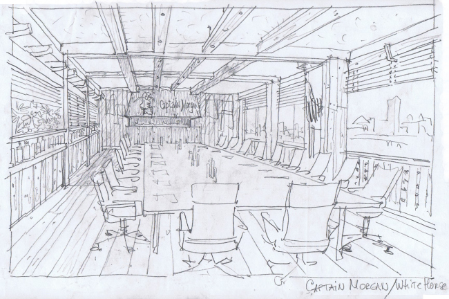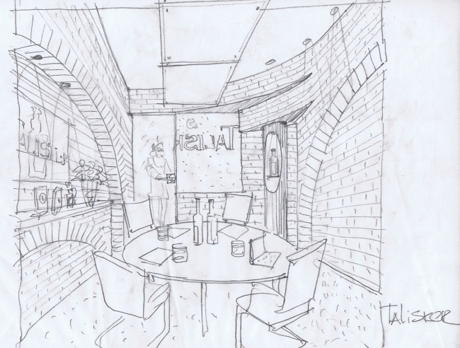 Так, для «представительства» знаменитого шотландского односолодового виски Талискер архитекторы, например, придумали помещение, имитирующее небольшую винокурню, выложенную из кирпича. Правда в эскизах все смотрелось куда брутальнее, признается Эстрин: и кирпич предполагалось использовать настоящий (а не плитку), и ниши сделать не декоративными, а вполне функциональными. Такой же брутальной должна была получиться комната брендов Captain Morgan и White Horse – эстетика рома натолкнула авторов на идею выполнить интерьер из мореного дуба, украсив обнаженные балки металлическими заклепками. В реальности кают-компания пиратского корабля выглядит не такой «прожженной» – светлый оттенок и полированная поверхность ламината создали эффект скорее камерный и подчеркнуто благообразный.