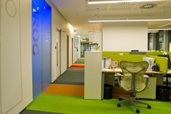 Отсюда и лаконизм оформления самой «улицы» – снаружи внешний вид переговорных унифицирован. В каждую из них ведут двери из матового стекла, украшенные стилизованным изображением бутылки. Единственное, чем они отличаются друг от друга – это цвет и собственно название бренда, которое также продублировано на табличках, вывешенных вдоль коридора и помогающих быстрее сориентироваться в «ассортименте». Вход в переговорные архитекторы также выделяют с помощью напольного покрытия другого цвета – в основном в оупенспейсе используется ковролин благородного темно-серого цвета, а из-под дверей выстреливают дорожки ярких тонов, как будто напитки смогли каким-то образом просочиться наружу. Эти яркие цветовые акценты распространяются дальше по офису – архитекторы используют аналогичные цвета для оформления перегородок между столами сотрудников, что привносит в сдержанную атмосферу оупенспейса ощутимую каплю легкости и позитива.