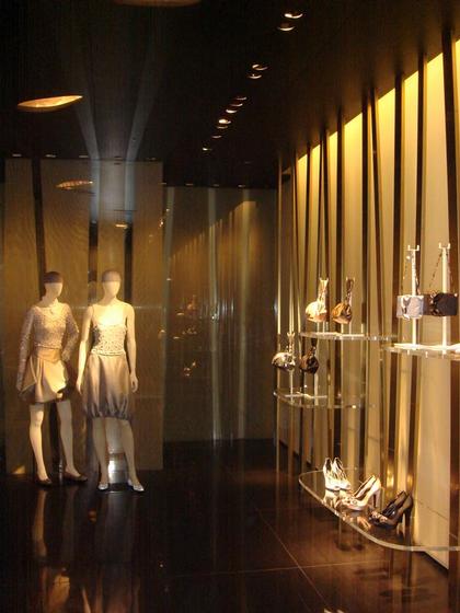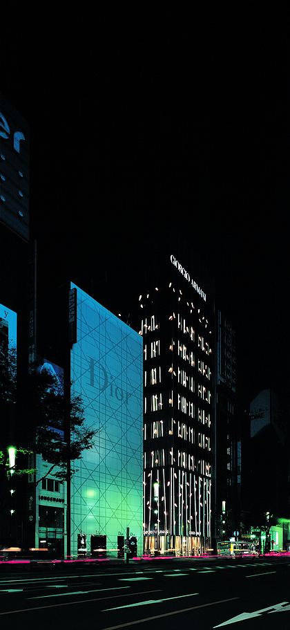 Речь идет о так называемом концепт-магазине, расположенном в башне «Армани Гиндза Тауэр». На ее 12 этажах расположены бутики мужской и женской одежды и аксессуаров этой итальянской марки, магазин предметов домашней обстановки, совмещенный с эксклюзивной дизайнерской мастерской, ресторан, кафе Emporio Armani Caffe, спа-центр, цветочный и книжный магазины, отдел косметики и парфюмерии, а также – шоу-рум. Так Гиндза, имеющий репутацию квартала дорогих магазинов еще с XIX века, возможно, пытается соревноваться с более современным Омотесандо, где сосредоточено большое количество бутиков международных модных брендов, выстроенных по проектам «звезд» мировой архитектуры. Более традиционный характер окружающей застройки наложил определенные ограничения на постройку Фуксаса: в частности, ему пришлось ограничить высоту своей башни 56 метрами, так как это законодательно установленный максимум для этого район Токио. Но, в целом, «Армани Гиндза Тауэр» производит впечатление очень сдержанного с формальной точки зрения сооружения: так как речь идет о коммерческом учреждении, архитектор согласовал свой проект с фирменным стилем Джорджо Армани, сочетающим «роскошь и строгую элегантность». Основной мотив решения фасадов и интерьера – использование бамбука и позолоченных металлических профилей, а также – молочно-белого матового оргстекла, использованного для более эффектной подсветки здания в темное время суток. В оформлении интерьера также широко применены ажурные золотые металлические панели, в частности, отгораживающие отдельные столики в ресторане башни. Черный и золотой – основные цвета постройки – будут также использованы в дизайне одежды специальной серии «Армани/Гиндза Тауэр», которую можно будет купить только в этом токийском магазине.