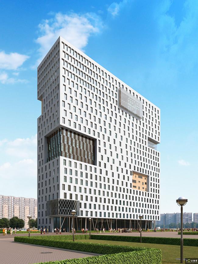 Главную же тему можно определить так: перед нами коллекция разнообразных фактур, употребляемых в наше время в офисных зданиях. Белая перфо-ткань основных плоскостей прорезана расположенными в хаотичном порядке крупными выступами и уступами, каждый из которых можно понять как фрагмент фасада другого офисного здания и пересаженный на здание iCube вследствие архитектурно-хирургической операции. Здесь можно найти стеклянные консоли-эркеры, как блестящие и гладкие, так и расчерченные на ромбы металлическим каркасом. Некоторые вставки из-за чередования прозрачных и темных стекол напоминают гигантские плазменные экраны – и соответственно вызывают «медийные» ассоциации. Также встречаются кирпичные врезки, напоминающие о многочисленных московских зданиях, которые сейчас все чаще обшивают пластиковыми панелями – как будто бы было кирпичное здание, его «одели», а несколько фрагментов оставили.