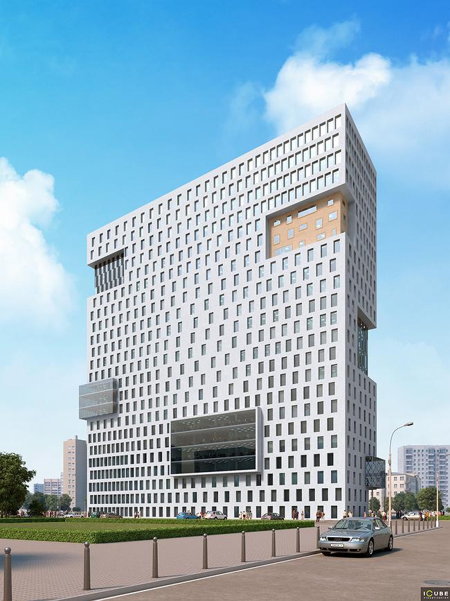 В итоге обычный фасад офисного здания превратился в проекте iCube в веселый постмодернистский коктейль из элементов рационализма, дигитальной архитектуры и авторской фантазии. Но некоторые кусочки привычного остекления здесь все же оставили, как напоминание или, скорее, как элемент игры.