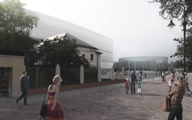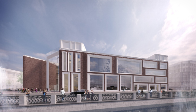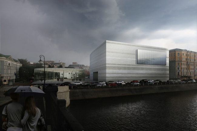 «В своем предложении мы позволили себе изменить и расширить рамки задания конкурса, который предполагал разработку только фасадов для уже существующего проекта. Мы же посчитали возможным частично пересмотреть предложенные решения. В частности, в нашем проекте изменения затронули угловую часть, на пересечении набережной с Лаврушинским переулком. При этом структура и планировка здания сохранены практически полностью. Была минимально откорректирована конфигурация основных помещений, концертный зал перемещен в подземную часть.