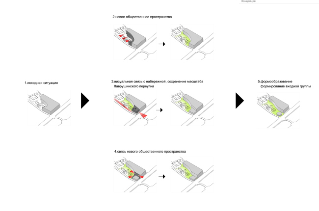 Мы попытались создать перед главным входом в здание новое общественное пространство, выходящее на набережную, в которое интегрированы все расположенные на территории галереи исторические здания вдоль Лаврушинского переулка. Созданное общественное пространство с прозрачным павильоном, обращенным к набережной должно превратиться в территорию демонстрации всего самого актуального и важного в области современного искусства. Его наполнение могло бы динамично меняться и трансформироваться, подстраиваясь под нужды галереи и выступая в роли места встреч людей, приобщая город к искусству.
