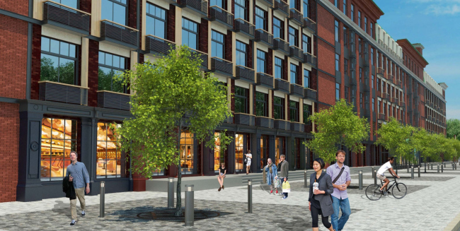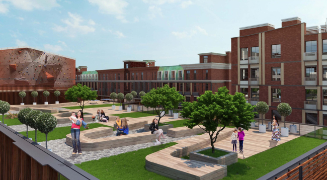Фактически единственное кардинальное изменение, которое вводится в облик данного объема, – это аккуратные балконы для кондиционеров, которые архитекторы делают максимально узкими и выполняют из черного металла для того, чтобы визуально минимизировать их присутствие на краснокирпичном фасаде. Чуть вольнее авторы проекта обращаются с более поздней малоэтажной пристройкой к этому корпусу: ее фасады дополняются вертикальными членениями с помощью деревянных колонн разного сечения, а кровля озеленяется и благоустраивается с тем, чтобы стать одним из главных общественных пространств нового района. Помимо довольно традиционных для такого рода мест отдыха со скамейками и игровыми площадками, здесь будет скалодром – под него приспособлена часть брандмауэра исторического здания, примыкающего к обитаемой кровле.