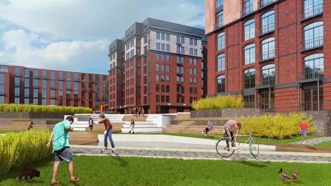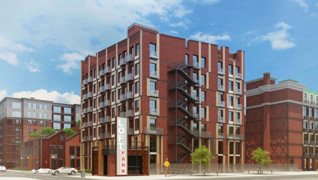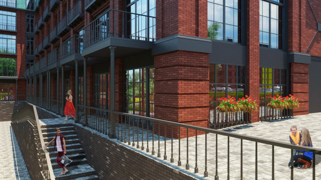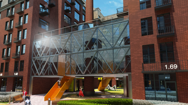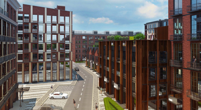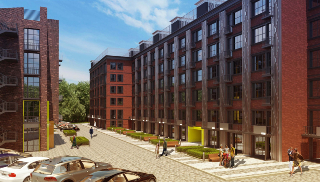 Лицом нового района становится длинный корпус 1, вытянувшийся вдоль Михалковской улицы. Сегодня это довольно унылое панельное строение 1960-х годов, которое Homeland group превращает в здание с выразительным многомерным фасадом. Используя в качестве основного облицовочного материала клинкерный кирпич, архитекторы дополняют его металлическими и каменными вставками, комбинируя их в разном порядке и тем самым придавая индивидуальность оконным проемам каждого этажа. Мансардный этаж при этом подчеркнут облицовкой из патинированной меди, а глухие кирпичные простенки стянуты металлическими швеллерами. Заданная этим корпусом палитра фактур и материалов так или иначе используется в решениях всех остальных строений Loft Park, хотя впрямую архитекторы не повторяются ни разу, разрабатывая индивидуальные «одежды» для каждого из них. Отметим также, что если первый этаж этого здания полностью отведен под общественные функции и фактически представляет собой широкие витрины, обращенные к Михалковской улице, то во всех остальных корпусах первые этажи – жилые, и расположение квартир «на земле» используется архитекторами для организации отдельных входов и благоустроенных придомовых территорий.
