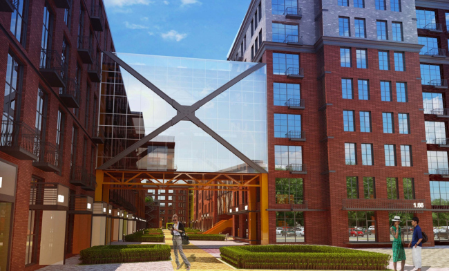 Еще один полностью сохраняемый элемент фабрики – существующая труба старой котельной. В проекте Loft Park она становится не только значимым ориентиром, но и местом сосредоточения деловой активности нового района – вокруг нее архитекторы выстраивает подвесной стеклянный блок офисов.