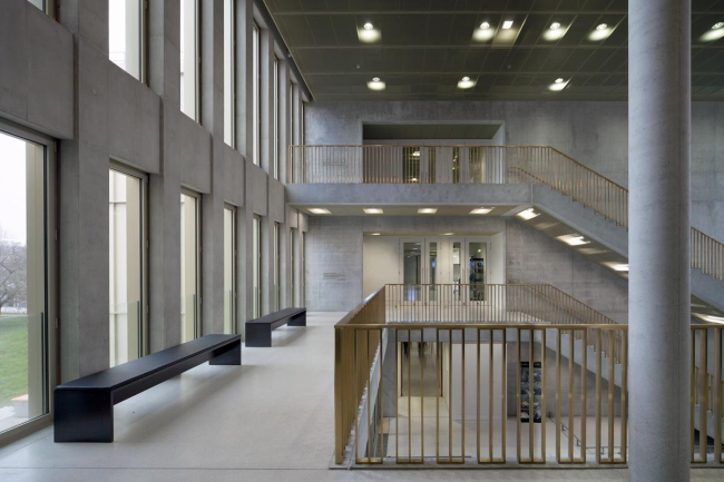 Чтобы придать этой внушительной постройке человеческий масштаб, Чипперфильд разбил ее на несколько блоков и выстроил их «лесенкой», сдвинув друг относительно друга. В результате, главный фасад приобрел динамику, а перед ним образовалась серия общественных пространств – «полудворов». Все фасады постройки обшиты панелями анодированного алюминия.