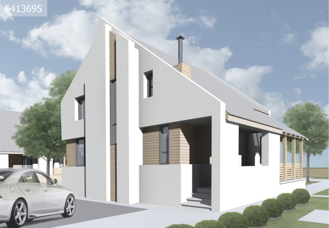 Наш индивидуальный жилой дом имеет традиционную двухскатную кровлю, конек которой мы ощутимо смещаем относительно центральной оси. Это придает силуэту коттеджей большую выразительность. И если на облике самой кровли подобная сдвижка никак не отражается, то облик боковых фасадов всецело продиктован ее тектоникой: с помощью узкой деревянной вставки фронтоны расщеплены на две половинки, которые словно существуют независимо друг от друга. На сочетании двух основных материалов – белой штукатурки и натурального дерева – и строится образ этого дома: за счет деревянных панелей разного размера мы визуально дробим фасады, лишая их ощущения монолитности. Эту же задачу решают оконные проемы, которые мы специально делаем разными (используя для этого рамы стандартных размеров, естественно), а также ниши входного крыльца и просторной веранды с обратной стороны дома. Кровлю над верандой мы предлагаем выполнить из полупрозрачного поликарбоната, – вставка из него врезана в скат кровли под собственным углом, что еще немного усложняет силуэт сооружения , придает ему некоторую пикантность.