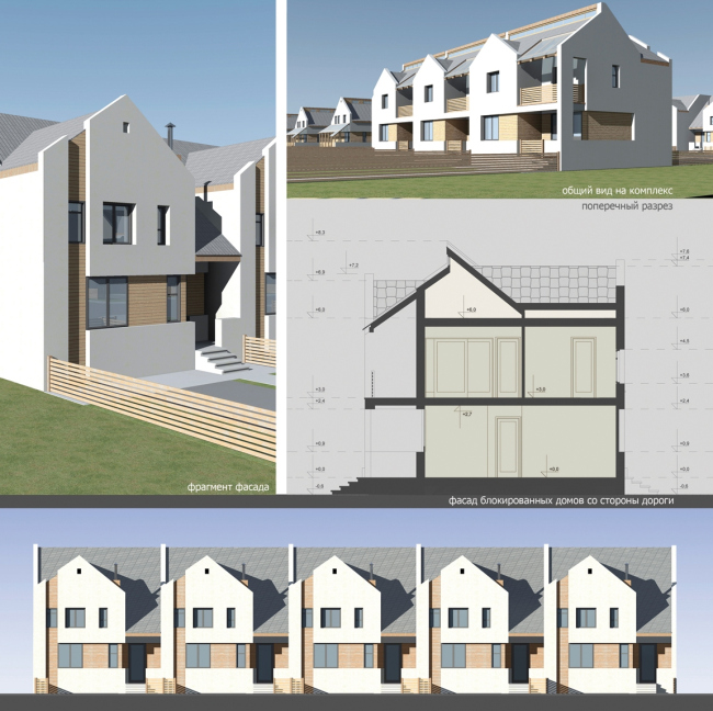 Многоквартирный жилой дом и таунхаусы фактически представляют собой модификации коттеджа. Блокированное жилье мы фактически «собираем» из тех же домов, немного подрезая их главные фасады и усложняя форму кровли. Принципиальным моментом для нас здесь было разнесение входов в каждую из секций – дома сблокированы таким образом, чтобы соседи не сталкивались постоянно у дверей, а видели друг друга издалека. У каждого таунхауса также имеется собственная терраса, но здесь для нее не пришлось делать отдельного навеса – она интегрирована в основной объем.