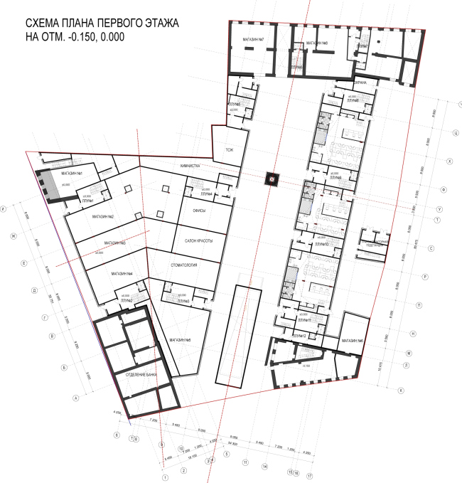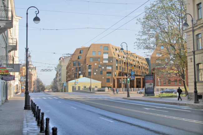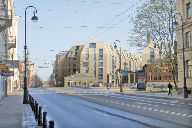 Предпроектные предложения по строительству жилого комплекса на набережной реки Карповки© Студия 44Собирая в единую композицию несколько столь разных по стилистике и масштабу объемов, архитекторы вполне предсказуемо трактовали новый комплекс как крупную лапидарную форму, которая заполняет собой существующую брешь в городской ткани и служит фоном для исторических объемов. Фасады «Дома Корлякова» и «Гранд-Паласа» тщательно реставрируются – первый превращается в кафе, второй становится частью встроенных торговых помещений вновь возводимого ЖК. При этом на красной линии Каменноостровского проспекта архитекторы сознательно оставляют только два этих домика – фасадная стена нового комплекса отступает от нее на 3 м вглубь участка, что позволяет акцентировать объемы зданий-памятников и зрительно выявить их глубину.