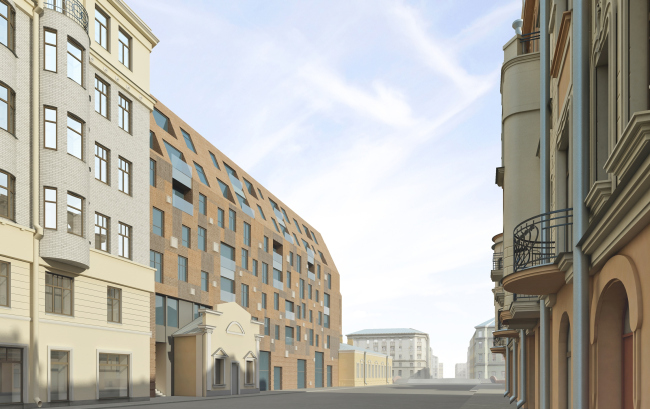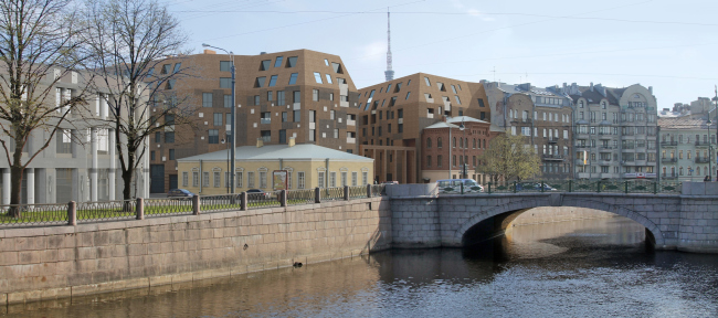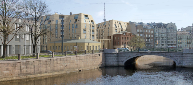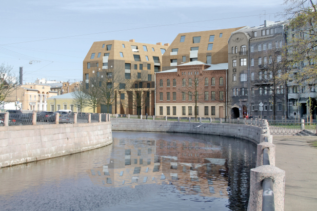 Предпроектные предложения по строительству жилого комплекса на набережной реки Карповки© Студия 44Что же касается построек фабрики, то их лицевые фасады также реставрируются, а конструкции и все конструктивные элементы, включая несущие стены, лестницы и даже колонны, сохраняются, позволяя создать внутри крупногабаритные квартиры a la loft. Отреставрированные краснокирпичные строения также словно прорастают из «тела» нового объема, однако их слияние не кажется вынужденным, поскольку архитектурное решение новых зданий представляет собой современную интерпретацию индустриального стиля. Лаконичную пластику фасадов, облицованных кирпичом или натуральным камнем, разнообразят лишь по-разному оформленные оконные проемы (в виде французских балконов и ниш, заглубленных в плоскость стены), да наклонные стены двух верхних этажей, в которые врезаны террасы-лоджии. Такой трапециевидный силуэт, несмотря на свою геометрическую обобщенность, точно попадает в масштаб застройки  Каменоостровского проспекта, делая новые дома заметными в панорамах улицы, но не диссонирующими с ними.