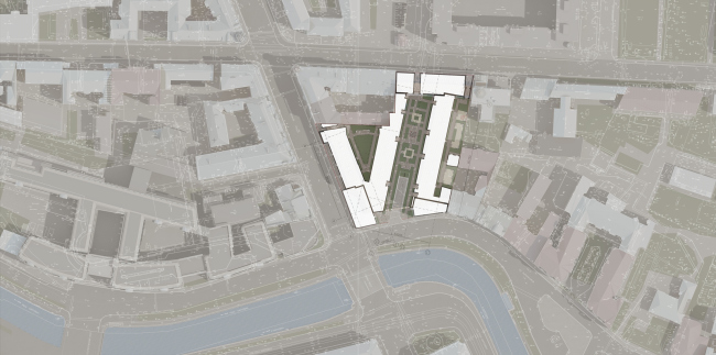 Предпроектные предложения по строительству жилого комплекса на набережной реки Карповки© Студия 44Добиться ощущения преемственности помогает и выбранное «Студией 44» общее композиционное решение нового жилого комплекса. «Именно в районе Каменноостровского проспекта и набережной Карповки архитекторы в начале XX века решились разомкнуть сплошной фронт уличной застройки и стали возводить дома с курдонерами. Эта планировка кажется нам выигрышной и с композиционной точки зрения, и с экономической, поэтому в своем  проекте мы решили использовать именно ее», – рассказывает Никита Явейн. В плане комплекс напоминает знак квадратного корня с загнутым хвостиком или буквы V и I, сверху соединенные планкой таким образом, что между ними, собственно, и возникает широкий прямоугольный в плане двор. А поскольку V своим заострением выходит точно на перекресток проспекта и набережной, то парадный двор оказывается полностью раскрыт на Карповку. С обратной стороны, внутри «галочки», возникает второй внутренний двор, но его треугольная форма и небольшие габариты предопределили создание здесь атриума.