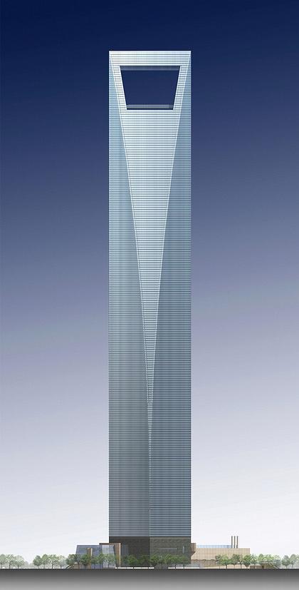 Официально строительство 492-метровой башни (95 этажей) должно было начаться в 1998 году, но тогда экономический кризис в Восточной Азии помешал продолжению работ. Стоимость постройки - 840 млн. евро, полезные площади в комплексе составят 317 000 кв. м. Новый небоскреб своей "монолитной формой", по словам архитекторов, будет способствовать структурированию "несвязной ткани застройки" кварталов финансового района Шанхая. Башня - треугольная в плане, с возрастанием высоты ее объем сводится к плоскому гребню на вершине. Для смягчения воздействия на здание ветров в центре ее верхней части будет сделано круглое отверстие 50 м в диаметре. Несмотря на сходство с огромной открывалкой для бутылок, такое решение несет и символическую нагрузку: круг - традиционный китайский символ неба. Закончить строительство планируется к концу 2007 года.Шанхайский Всемирный финансовый центр