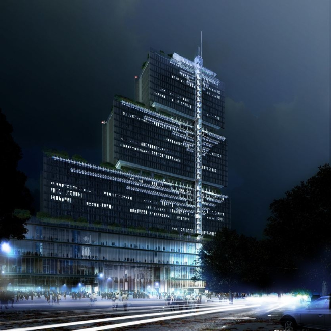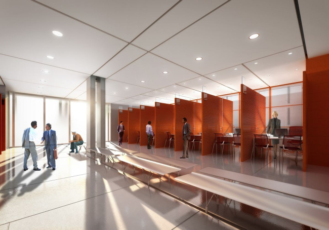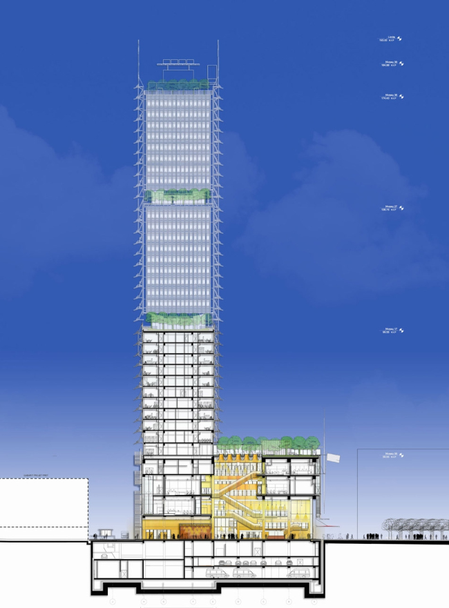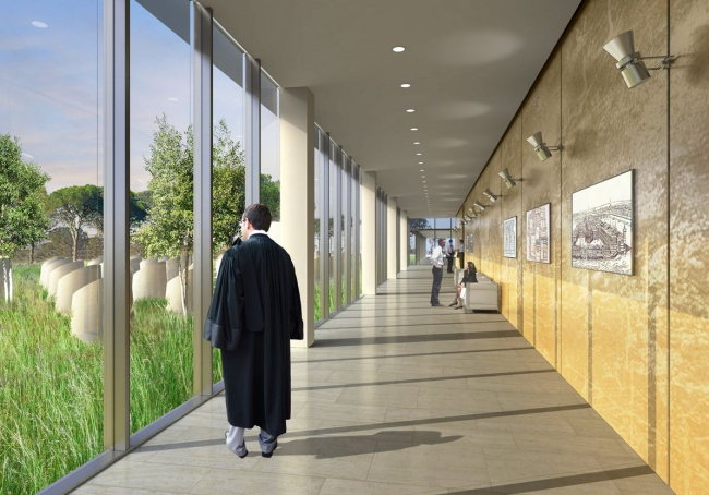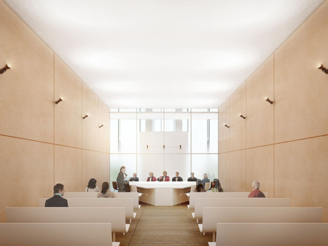 Над вестибюлем расположены 90 залов судебных заседаний. Во втором объеме находятся кабинеты служащих, в третьем – прокуратура, в самом верхнем, четвертом – кабинеты судей. Снаружи перепады между блоками оформлены как засаженные деревьями террасы. По центру фасада проходит «спинной плавник» – шахта панорамных лифтов.