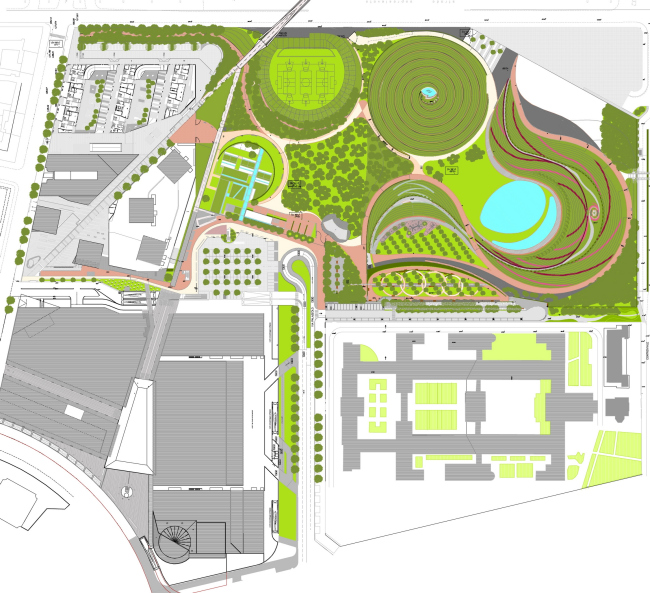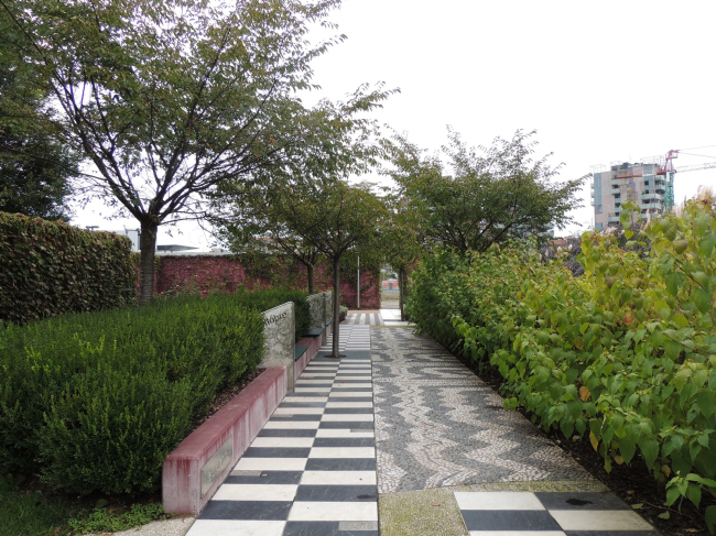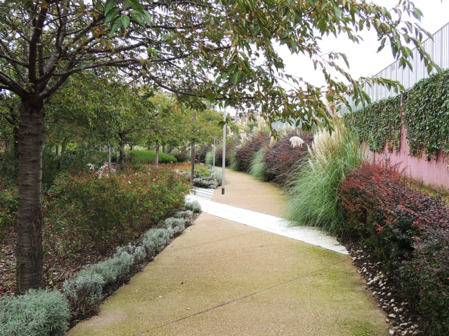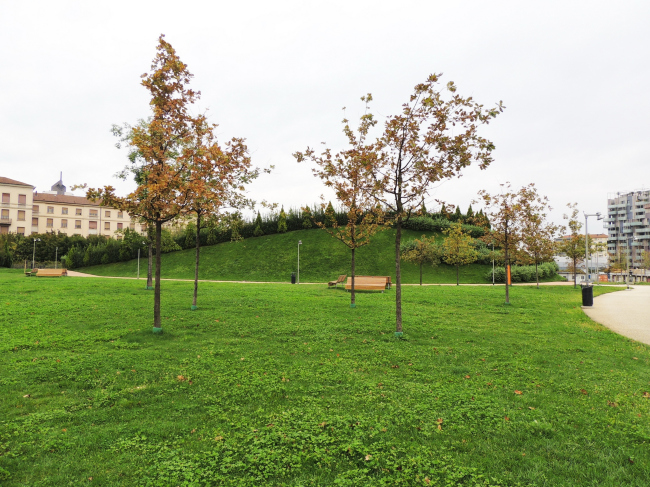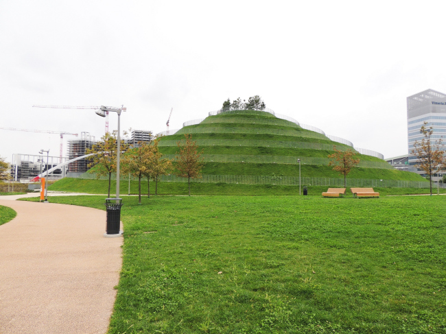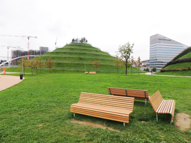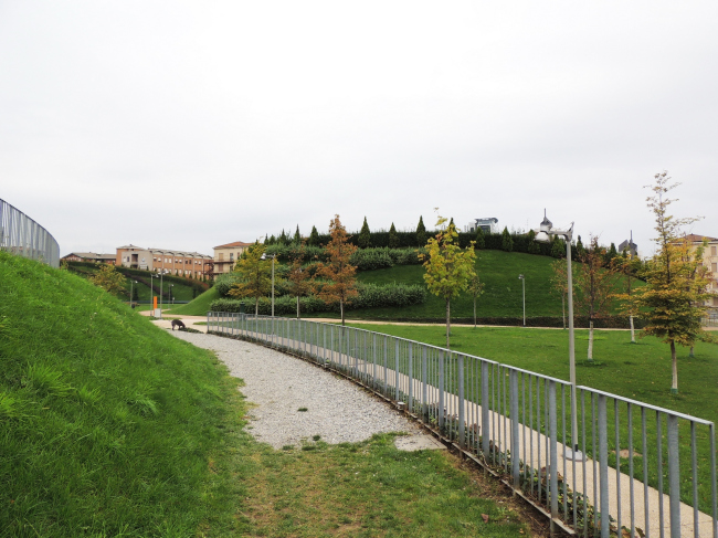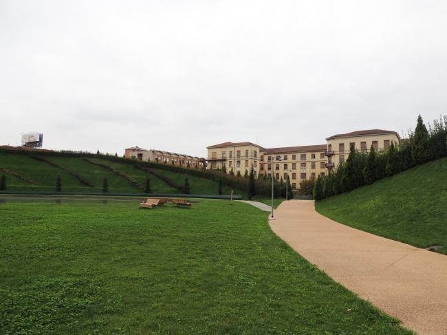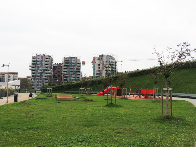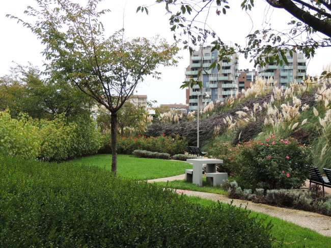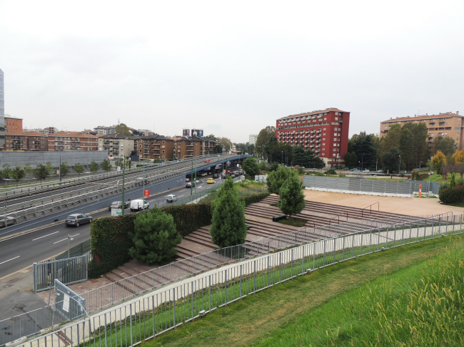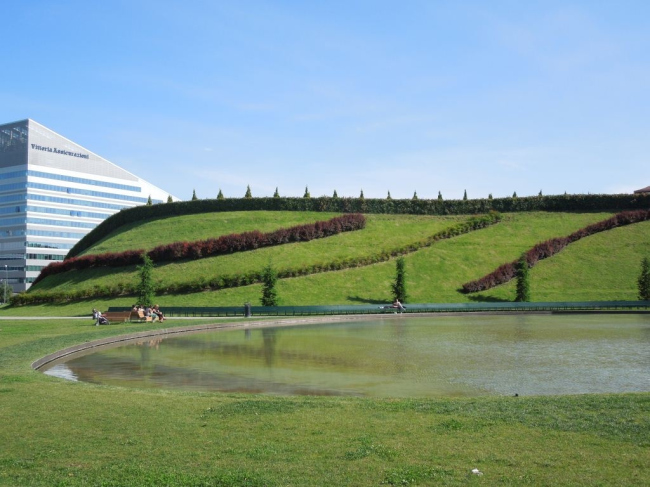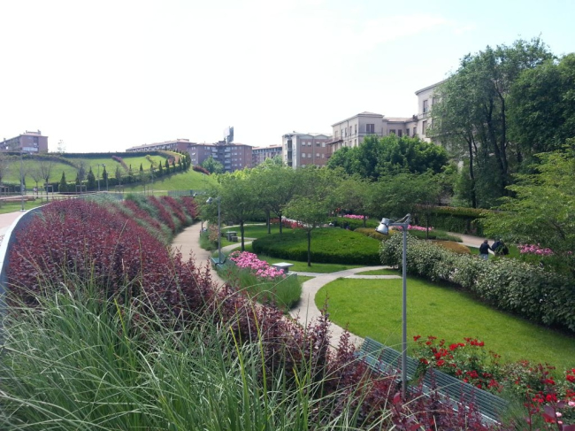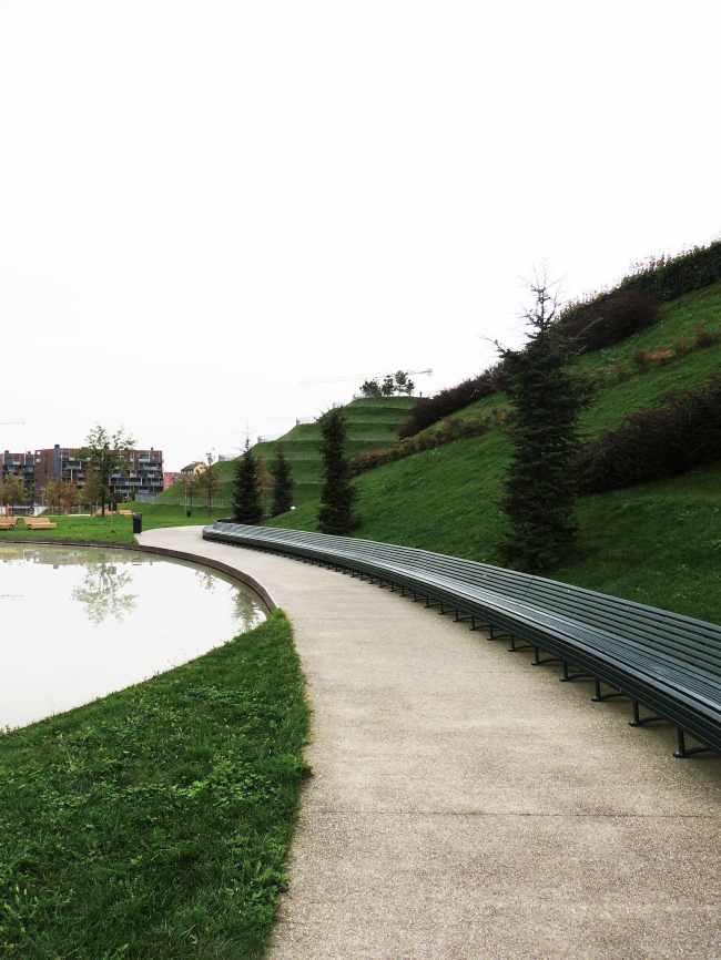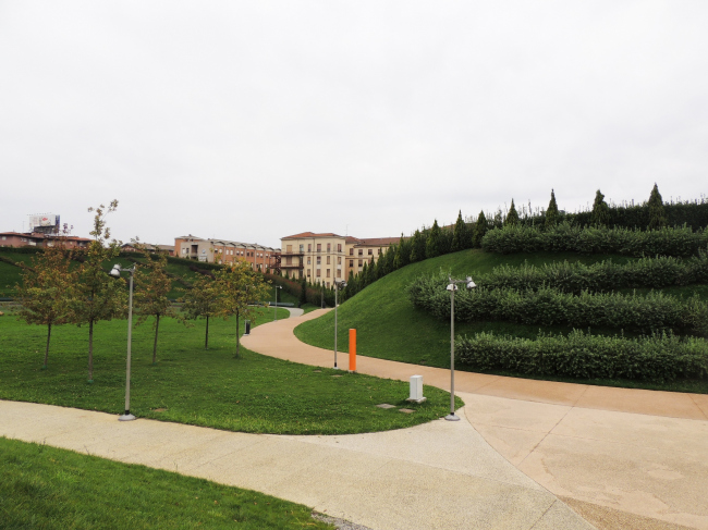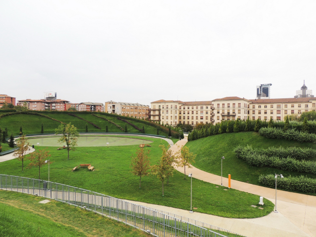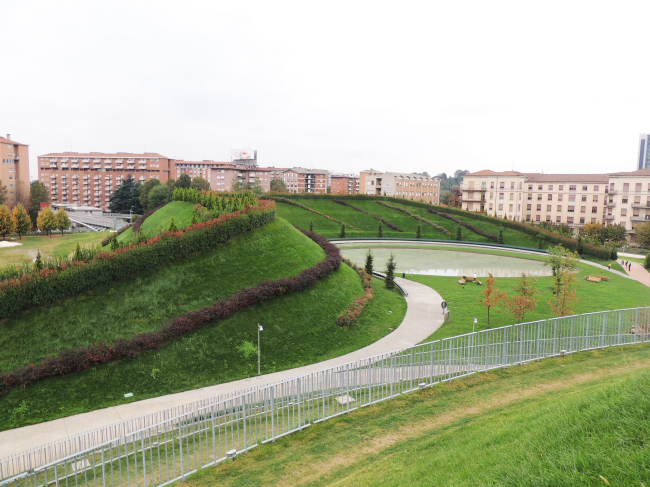 Отдельная история – это реализация проекта парка. Строительный мусор, оставшийся от завода Alfa Romeo и Lancia, был использован для создания «базы» по всей его площади: она приподнимает парк над уровнем улицы на 3 метра. По периметру базу удерживает бетонная подпорная стенка. Интересно, что почти 30% бюджета парка ушло на эту стенку и металлические ограждения.