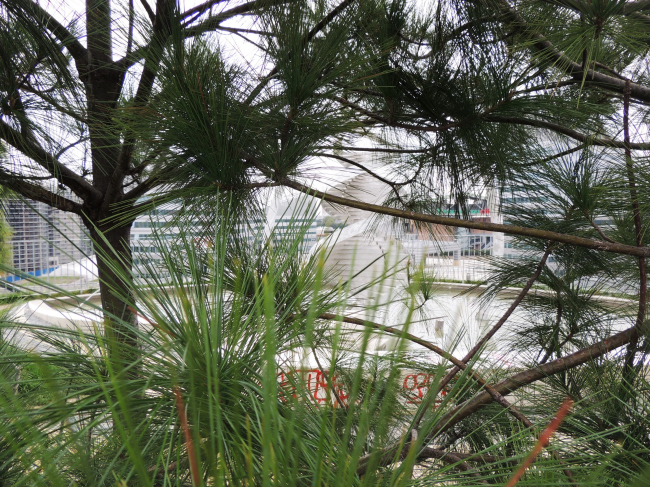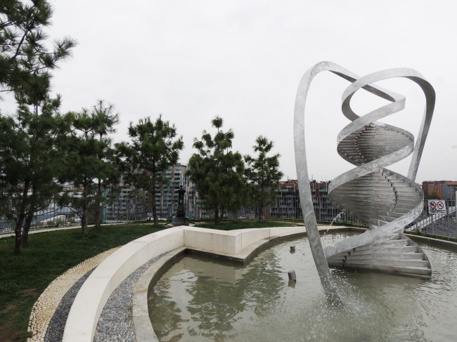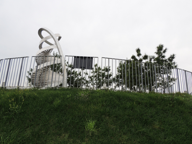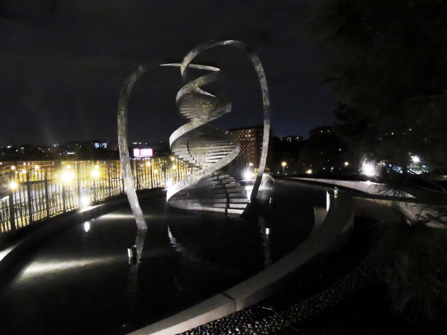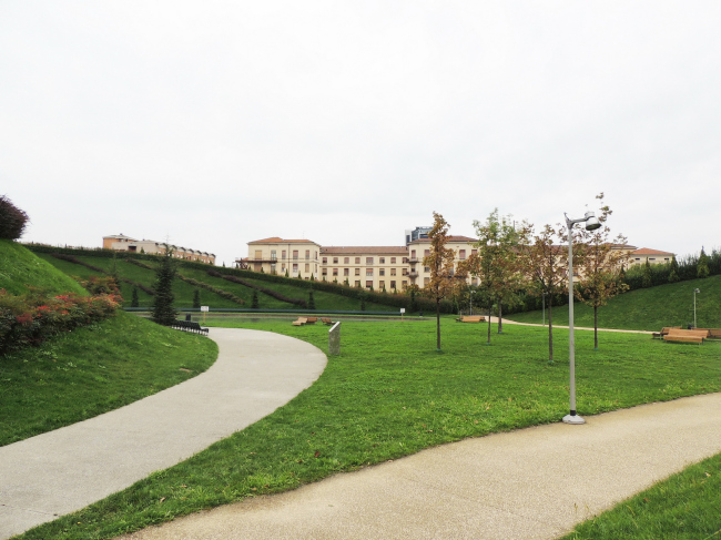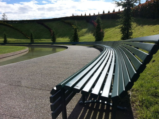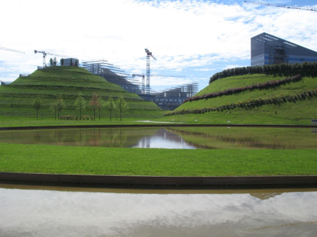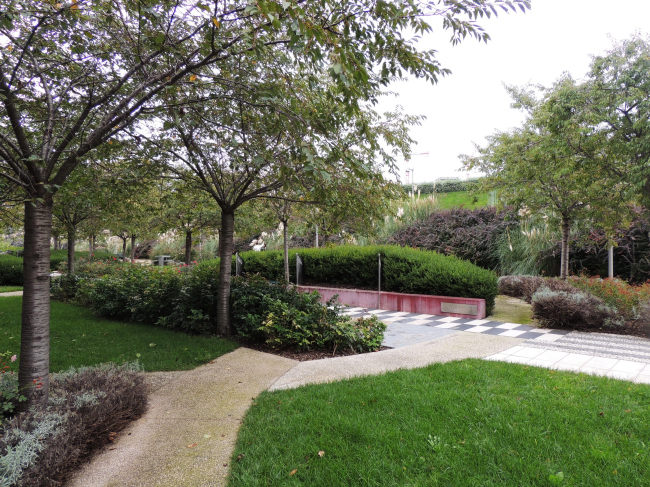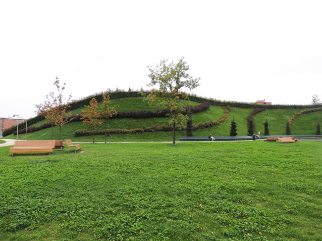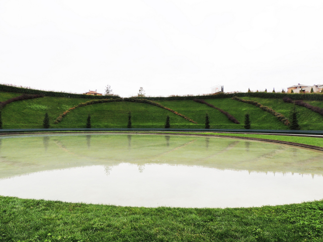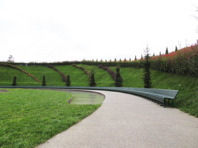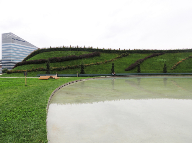 Все три «холма времени» объединены водой – округлым прудом. Архитекторы назвали его «Приют для лягушек», но лягушек, правда, здесь совсем не видно. Зато пруд огибает «бесконечная» скамейка.