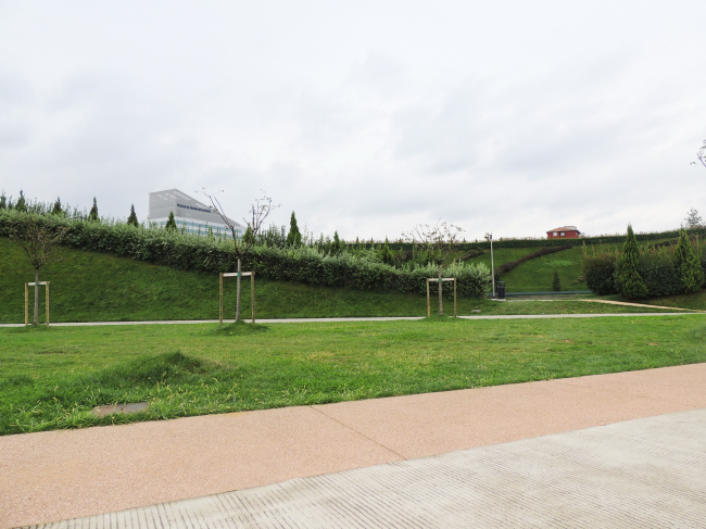 В конце работы в парке была устроена оросительная система, и холмы были покрыты 40-сантиметровым слоем почвы на геосетке. Когда строительство было закончено, по оросительной системе пустили жидкость из натурального клея, наполнителя, красителя и семян травы. Параллельно были высажены клены, платаны и остальные деревья.