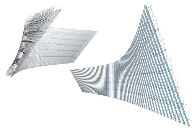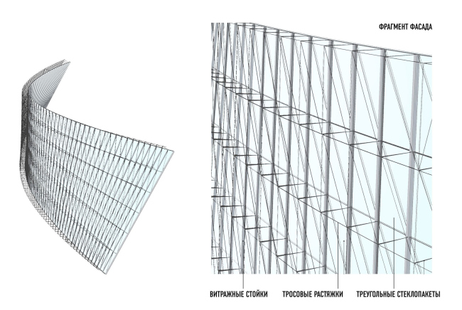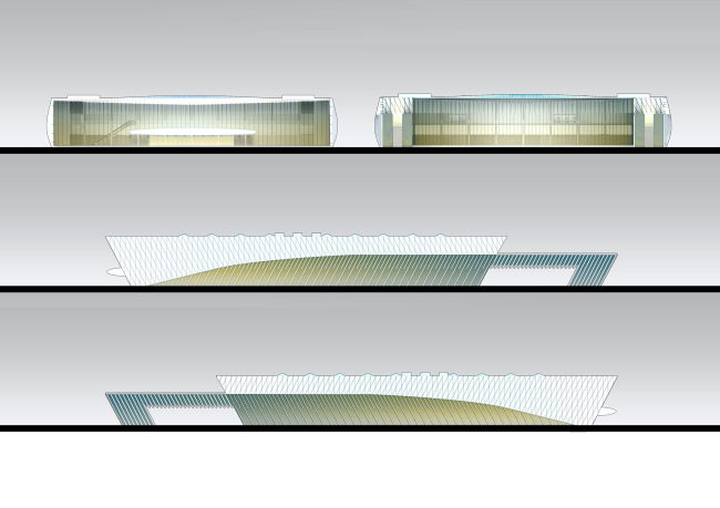 «Начав работать с этой условной коробкой, мы первым делом определили, какие элементы фасада активнее всего будут влиять на дизайн-концепцию, – рассказывает Андрей Асадов. –  Помимо входной зоны, это, конечно, были служебные и технические вход, а также витражи тех зон, где пассажиры проводят больше всего времени». Для того, чтобы избежать на боковых фасадах появления многочисленных «заплаток» из окон и дверей, архитекторы решили объединить все проемы в одну форму. Фактически они вырезают в боковом фасаде  большую полуарку, которая затем переходит на телетрап.  Пространство под ней прикрывают пилонами, а самой стене еще и придают не очень сильный, но заметный наклон. Точно так же предлагается наклонить и основания телетрапов, тем самым придав «профилю» здания очевидное сходство с фюзеляжем самолета.