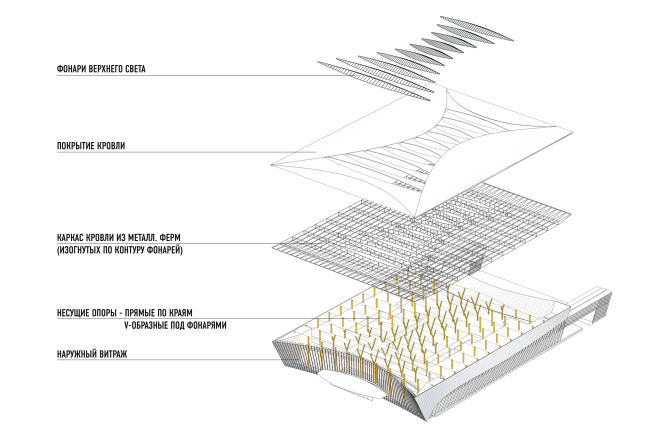 Дизайн кровли логично дополняет выбранную стилистику плавных криволинейных форм. Ее центральной части архитекторы в плане придают сходство с песочными часами, «заполненными» световыми фонарями все той же эллипсоподобной формы, длина которых уменьшается по мере приближения к центру здания. Эти «линзы в небо» выделяют в структуре аэропорта зону перемещения основных пассажирских потоков и, естественно, помогают сделать ее максимально светлой.