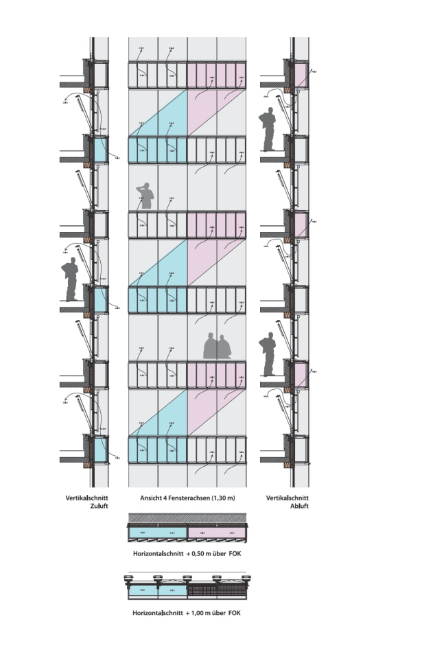 Каркас башни выполнен из железобетона: нагрузку несут круглые колонны, в центре расположен «стержень» с коммуникациями. Компактный объем работает на уменьшение теплопотерь. Так как фасады остеклены, главной задачей в деле достижения стандарта PassivHaus было предотвратить перегрев интерьера из-за солнечного жара, так как башня обращена на запад. Поэтому постройку снабдили двойным фасадом: его внутренний слой состоит из открывающихся окон Schüco с тройным остеклением (50/75 мм), далее, в зазоре шириной 625 мм, установлены солнцезащитные экраны (ими управляет автоматическая система), а внешний слой образован остеклением из ламинированных панелей со стеклянными ламелями (16 мм).