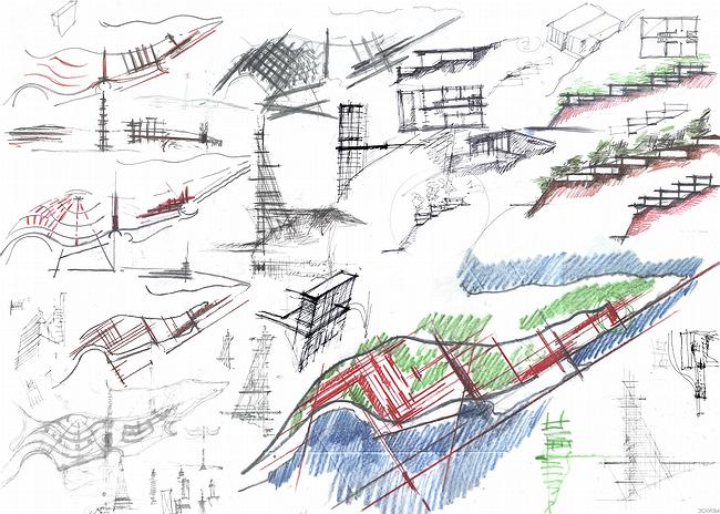 И все же в двух столь разных вариантах прочитывается общая подоснова – «решетка», линии которой либо расходятся, либо пересекаются, образуя ромбические переплетения. Линии этой сетки не ограничиваются традиционно отведенной им ролью несущих опор и не заканчиваются у основания поддерживаемых объемов. Напротив, они либо окружают здания наподобие строительных лесов, либо пронизывают их насквозь, прорастая сквозь крыши. Представляя таким образом нам на обозрение некоторую полупрозрачную пра-конструкцию, подобному театральным механизмам в постановках Мейерхольда.
