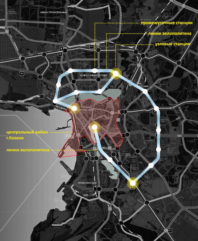 Казань развивалась в рамках радиальной планировочной структуры, постепенно приобретая новые районы и более крупный масштаб. Сейчас в городе имеется «окольцовывающая» его протяженная, широкая и загруженная окружная дорога, проходящая через густонаселенные территории. По всей ее длине две многополосные проезжие части разделены идущими посередине трамвайными путями. По этой дороге можно было бы проложить линию велополитена, совмещенного с маршрутом трамвая. Вдоль набережных тоже возможно провести ветку велополитена. Надземный велотоннель также мог бы связать между собой спортивные объекты, благо они имеют достаточно места для размещения узловых станций.