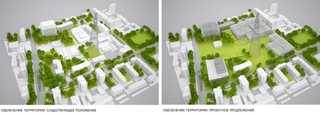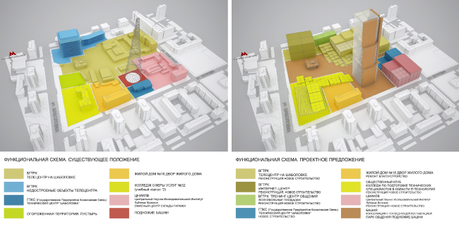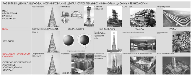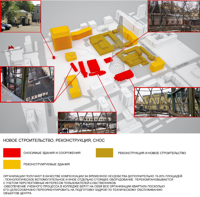 Одним из основных объектов здесь должен стать центр СИ-технологий, основывающийся на развитии идей, изобретений и патентов Шухова. Здание колледжа предлагается перепрофилировать для подготовки технических специалистов по обслуживанию СИ-технологического оборудования. Также на территории квартала в одном из исторических зданий должен быть организован музей башни Шухова и истории российского телевидения. Принадлежащий ТВ-центру долгострой мог бы стать интернет-центром российского телевидения. На основе примыкающего к нему невысокого недостроенного корпуса авторы придумали создать волейбольный клуб.