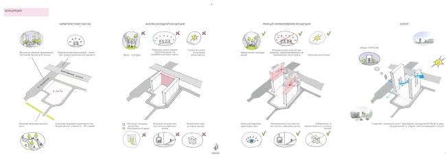 Как вспоминает Владимир Плоткин, участвовать в этом конкурсе он согласился, прежде всего, из-за площадки. Архитектор сам живет недалеко и знает этот район очень хорошо. «Провал» в градостроительной ткани, существующий на пересечении Рублевского шоссе и Ярцевской улицы, давно «мозолил глаз», и возможность переосмыслить эту ситуацию, предложить свое решение проблемы, искренне его заинтересовала. Более того, стоило архитекторам получить на руки техническое задание, и решение будущего комплекса пришло само собой. Рука, державшая карандаш, нарисовала эскиз прежде, чем архитектор успел дочитать все пункты ТЗ до конца. И это спонтанно пришедшее решение показалось настолько оптимальным, что больше композиционно-планировочную идею уже не меняли – лишь дорабатывали программу и фасады. Конкурсный проект жилого комплекса на Рублевском шоссе © ТПО «Резерв»