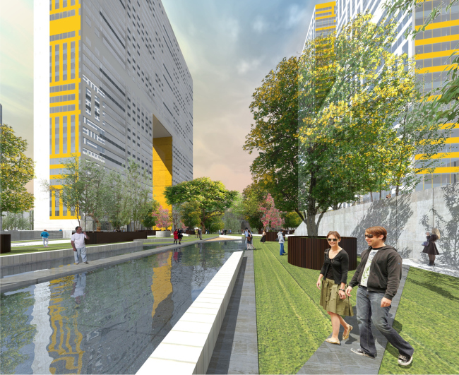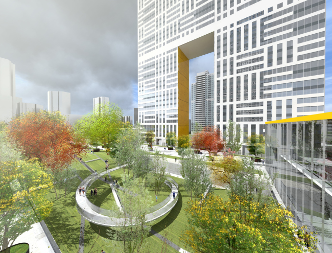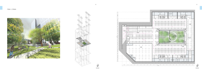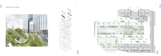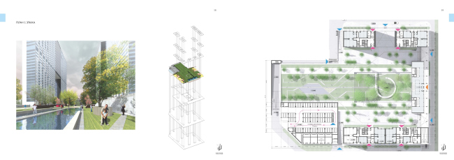 Остальная часть стилобата, на самом деле занимающего весь участок, отведена под парковки, а на его кровле архитекторы создают озелененный двор, предназначенный для жильцов комплекса. Этот, казалось бы, вполне стандартный элемент архитекторы максимально насыщают функциями: здесь и спортивные площадки (на кровле гостевой парковки), и тенистый сад (для высадки крупномеров предлагается сделать полноценный грунт, пожертвовав частью машиномест в подземной парковке), и детские площадки. В единой ландшафтной системе удается создать систему разнообразных общественных пространств, в которой нашлось место даже для небольшого стильного водоема. А озеленение фрагмента кровли в восточной части комплекса (та сама перекладина перевернутой «П») позволит создать дополнительную лаунж-зону под открытым небом на высоте 21-го этажа. Конкурсный проект жилого комплекса на Рублевском шоссе © ТПО «Резерв»