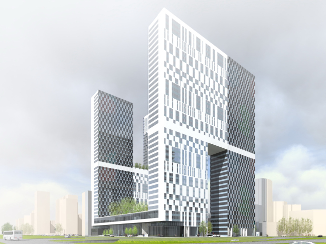 Архитекторы разработали сразу несколько вариантов решения фасадов, кардинально отличающихся друг от друга. Один из них основан на использовании крупной «графики», образованной диагональю, возникающей за счет совмещения горизонтальных и вертикальных простенков, во втором случае каждая из пластин условно делится на две части, одну из которых архитекторы покрывают фрактальным узором, а вторую мелкими «пикселями». Конкурсный проект жилого комплекса на Рублевском шоссе © ТПО «Резерв»